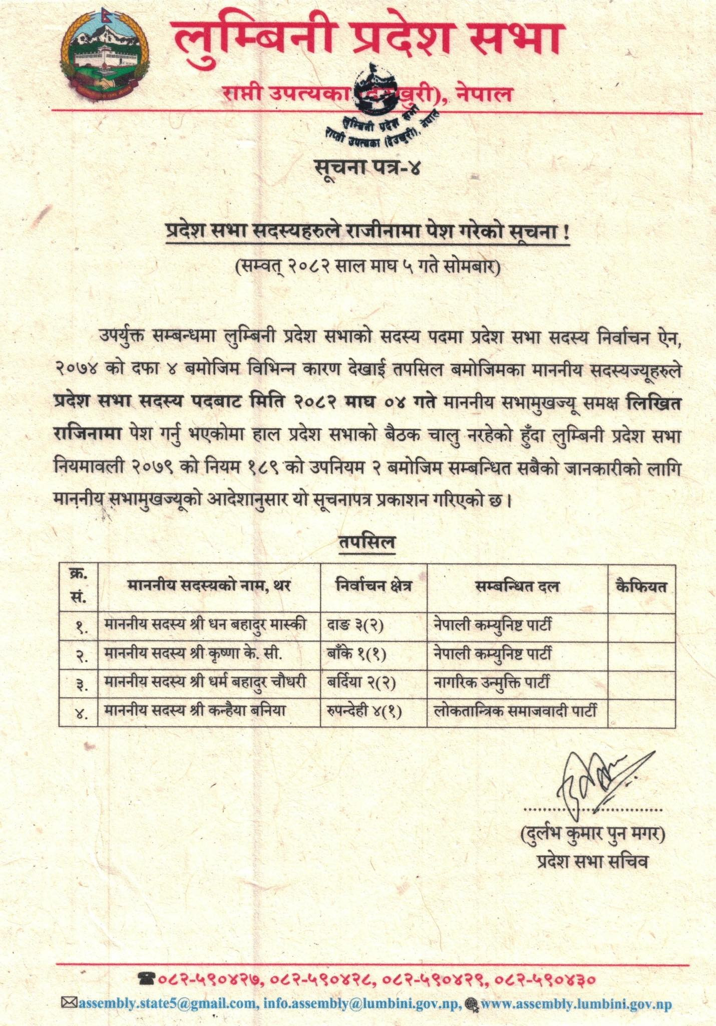 दाङ- प्रतिनिधिसभा निर्वाचनमा उम्मेदवारी दिन लुम्बिनी प्रदेशसभाका चार जना सदस्यले पदबाट राजीनामा दिएका छन्। प्रदेशसभा बैठक सञ्चालनमा नरहेको अवस्थामा नियमावलीअनुसार सूचना प्रकाशित गरी यसबारे जानकारी गराइएको प्रदेशसभा सचिव दुर्लभकुमार पुन मगरले बताए।